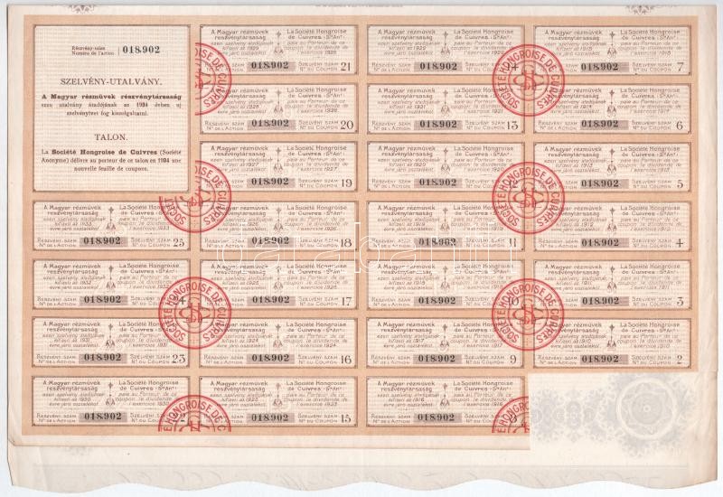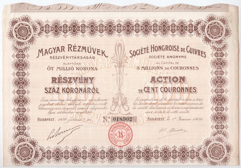 Budapest 1909. "Magyar Rézművek Részvénytársaság" részvénye magyar és francia nyelven, 100K-ról, szelvényekkel T:II-,III tűnyom / Hungary / Budapest 1909. "Hungarian Copper Works Share Company" share In Hungarian and French, about 100 Korona, with couppons C:VF,F needle holes