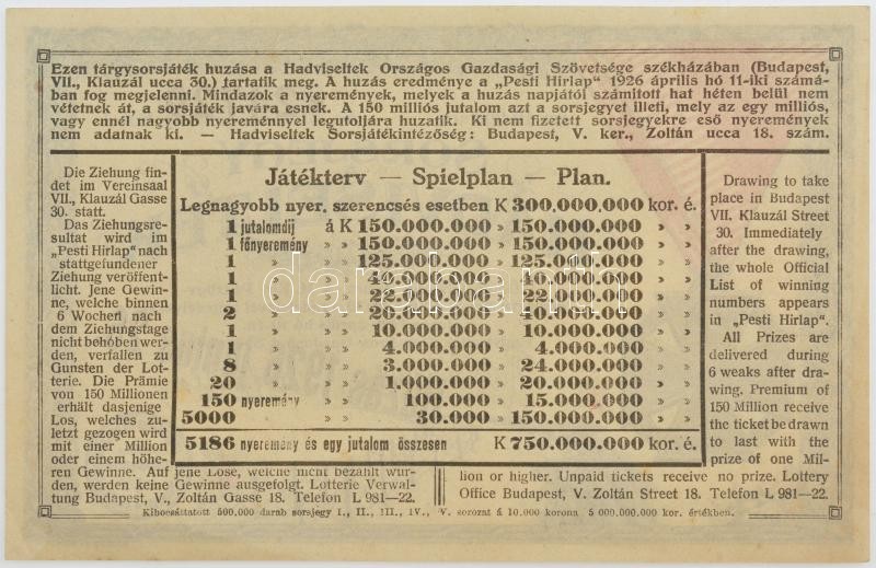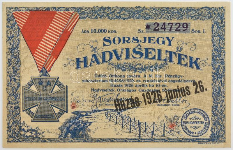 Budapest 1926. "Sorsjegy a Hadviseltek Üdülő Otthona Javára"... https://www.darabanth.com/en/39-Major-auction/39.1/Numismatics/Shares-Securities-and-Tickets~16025/Budapest-1926-Sorsjegy-a-Hadviseltek-Udulo-Otthona-Javara-10000K-rol-24729-sorszammal-~II2724899