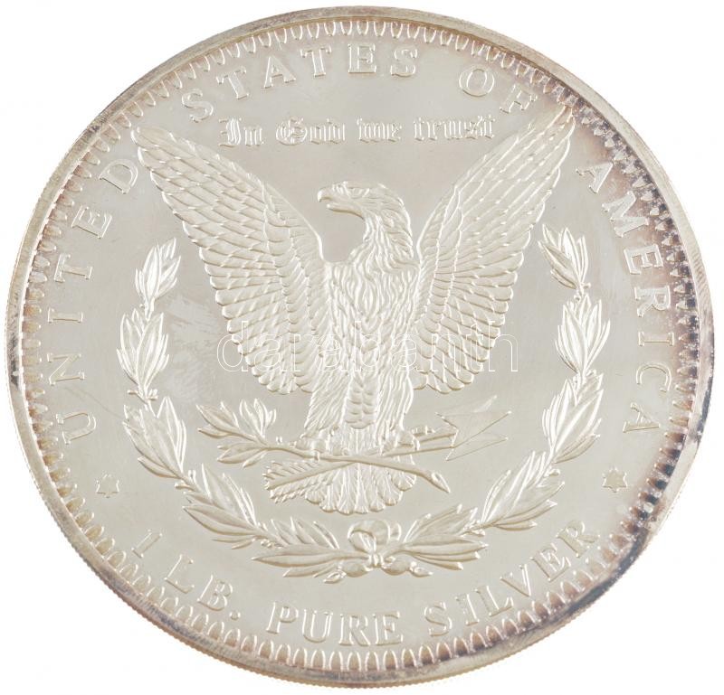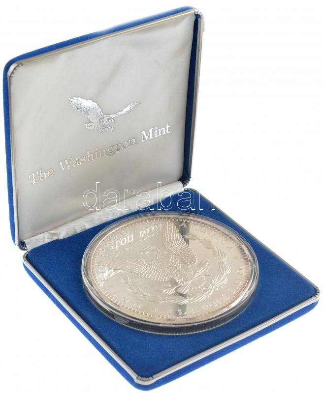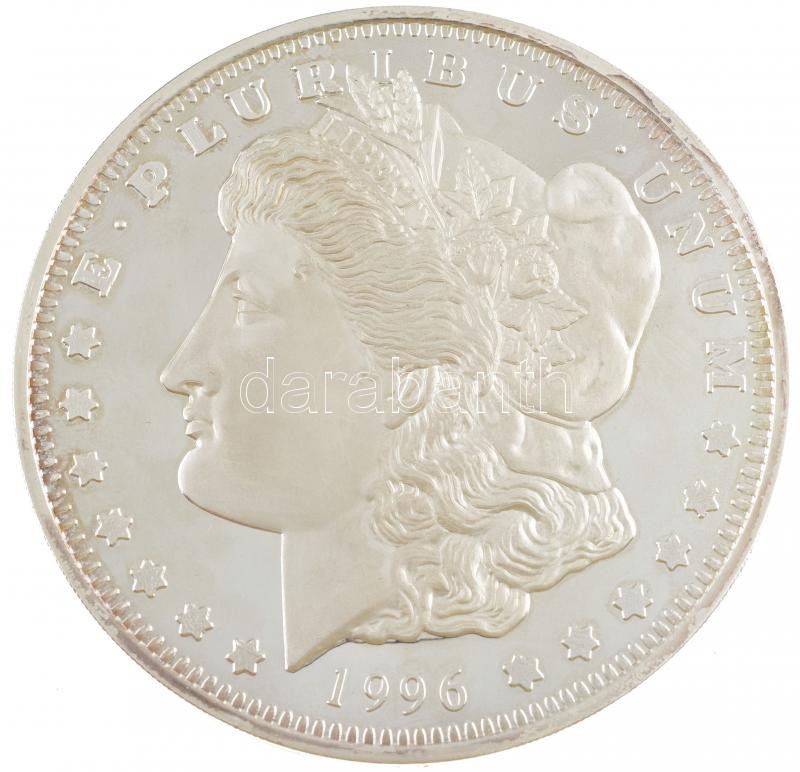 Amerikai Egyesült Államok 1996. "United States of America / E Pluribus Unum" kétoldalas jelzett Ag emlékérem a Morgan 1$ érme mintájára, kapszulában, díszdobozban, peremén "49" sorszámmal (498,84g/0.999/89mm) T:1 (eredetileg PP) patina, fo. / USA 1996. "United States of America / E Pluribus Unum" two-sided, marked, Morgan Dollar-look Ag medallion in capsule, in case, with "49" number on the edge (498,84g/0.999/89mm) C:UNC (originally PP) patina, spotted