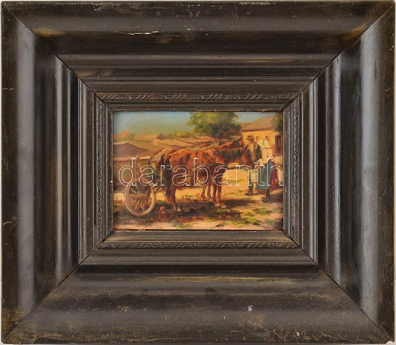 Pállya Carolus (1875 - 1948-50 körül): Ló itatás. Olaj, falemez, jelezve balra lent: Carolus Pállya, dekoratív kopott fakeretben, 11x16 cm