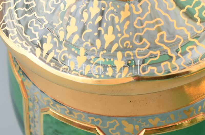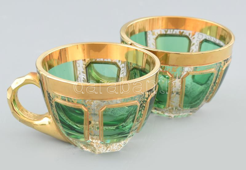 Description: Koloman Moser kristály üveg mokkás készlet. XX. sz. eleje. Hat személyes, komplett. Aranyozott, csiszolt, anyagában színezett, jelzés nélkül. Az aranyozáson néhány minimális hibával / Koloman Moser crystal coffee set for 6 persons. Not signed. A few minor faults on the gold layer.