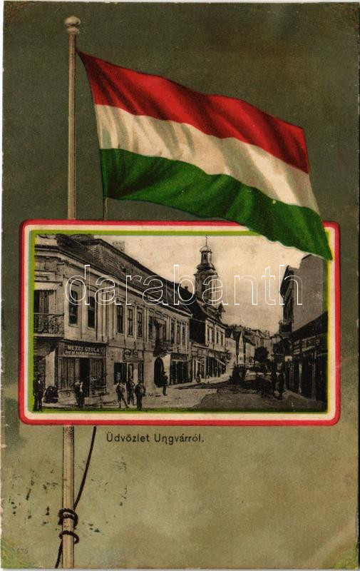 Description: 1909 Ungvár, Uzshorod, Uzhorod; Fő utca, mezei Gyula liszt, só és rizs kereskedő üzlete. Székely és Illés kiadása, Szecessziós magyar zászlós montázs / street, shops. Art Nouveau, Hungarian flag, litho (r)