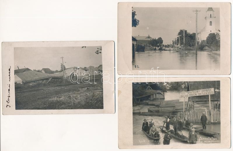 1933 Tiszaújlak, Vulok, Vilok, Vylok; Árvíz pusztításai: Templom utcai romok, heti vásár, faúsztatás a város közepén Friedmann Áron fatelepével és cementgyárával, Ilosvai utca összedőlt házakkal - 7 db eredeti nagyon ritka fotó feliratozva, Amsel Izrael órás, ékszerész, látszerész és fényképész felvételei / flood and its destruction on the streets - 7 original rare photos