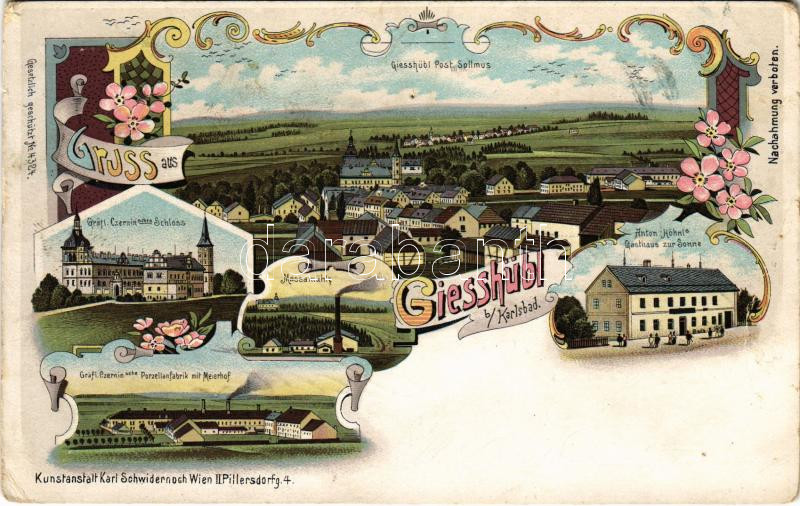 1899 (Vorläufer) Kyselka, Giesshübl, Gießhübl Sauerbrunn (Karlovy Vary, Karlsbad); Gräftl. Czernin'sches Schloss, Porzellanfabrik mit Meierhof, Massamühle, Anton Höhnl's Gasthaus zur Sonne / castle, porcelain factory, mill, restaurant and hotel, dairy farm. Art Nouveau, floral, litho (EK)
