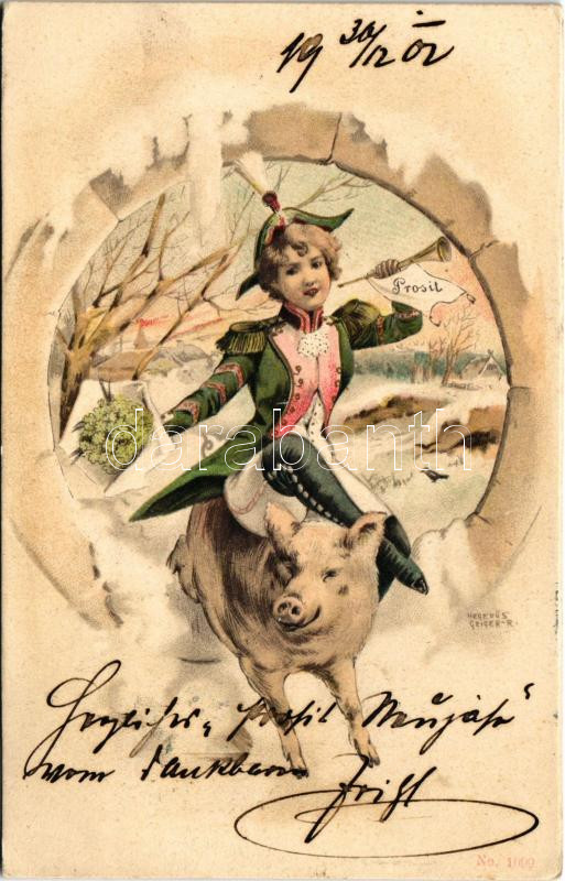 1902 Szecessziós újévi üdvözlet, malacon lovagló hölgy / Art Nouveau New Year greeting, lady riding on a pig. litho s: Hegedűs Geiger R. (EK)