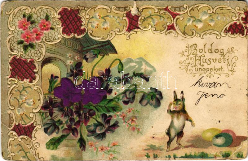 1903 Húsvéti üdvözlet! Dombornyomott nyuszis litho képeslap selyem rátéttel / Easter greeting, rabbit. Embossed, floral, litho silk card (EB)