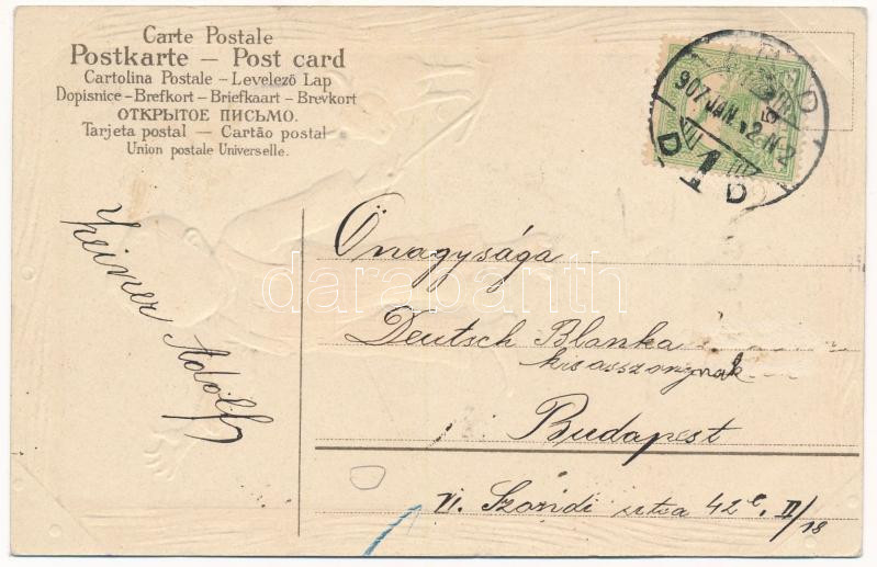 https://www.darabanth.com/en/39-Major-auction/39.1/Postcards/Greeting-Cards-Holidays~16126/1907-Boldog-uj-evet-Dombornyomott-szecesszios-litho-New-Year-greeting-Art-Nouveau-embossed-l~II2741941