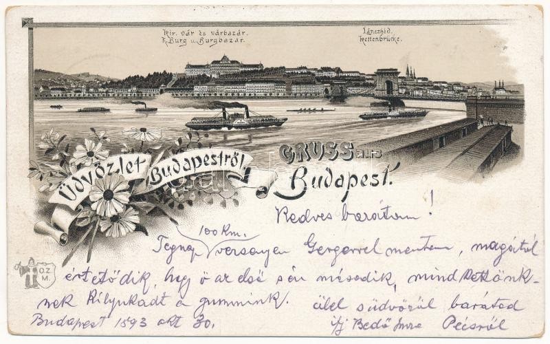 1893 (Vorläufer) Budapest, Királyi vár és várbazár, Lánchíd. Art Nouveau, floral, litho