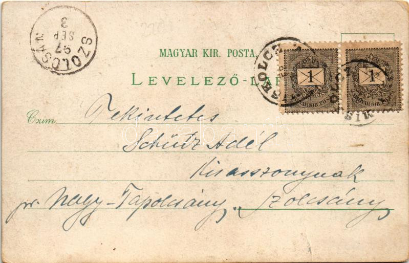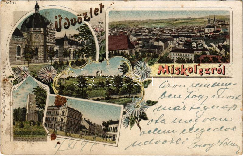 1897 (Vorläufer!) Miskolc, Pálóczy emlék, kálvária, városház, Erzsébet fürdő. Lövy József és fia Art Nouveau, floral, litho (fa)