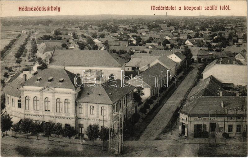 1909 Hódmezővásárhely, Madártávlat a Központi szálloda, sörcsarnok és étterem felől, zsinagóga, Schillinger üzlete. Posztós Pál kiadása