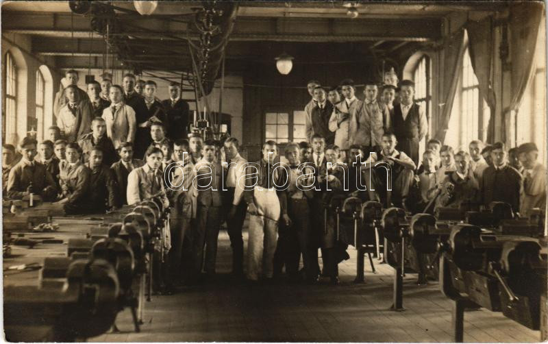 Budapest VIII. Magyar Királyi Állami Felső Ipariskola 1920-21. évfolyam tanulóinak csoportképe a műhelyben, belső. Gutenberg tér 4., photo