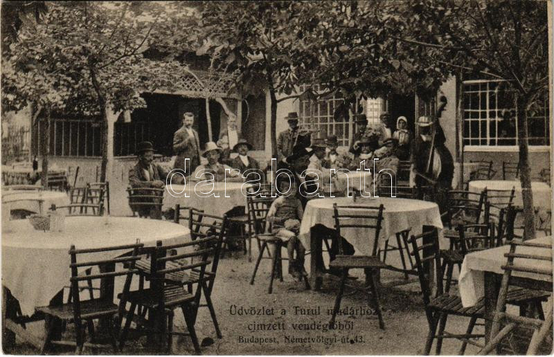 Budapest XII. Üdvözlet a Turul madrához címzett vendéglőből, kert, cigány muzsikusok. Németvölgyi út 43.
