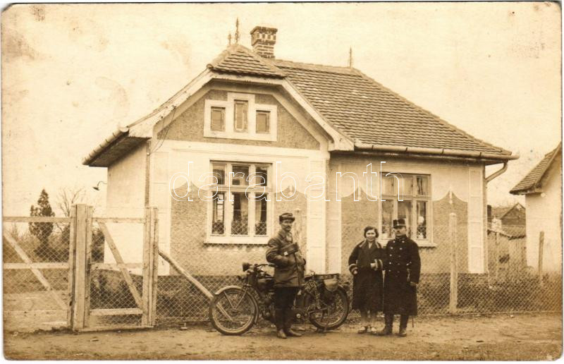 Debrecen, Anduska József képesített kőművesmester motorkerékpárral a saját háza előtt a Jánosi utca 64. szám alatt, katonatiszt. photo (EK)