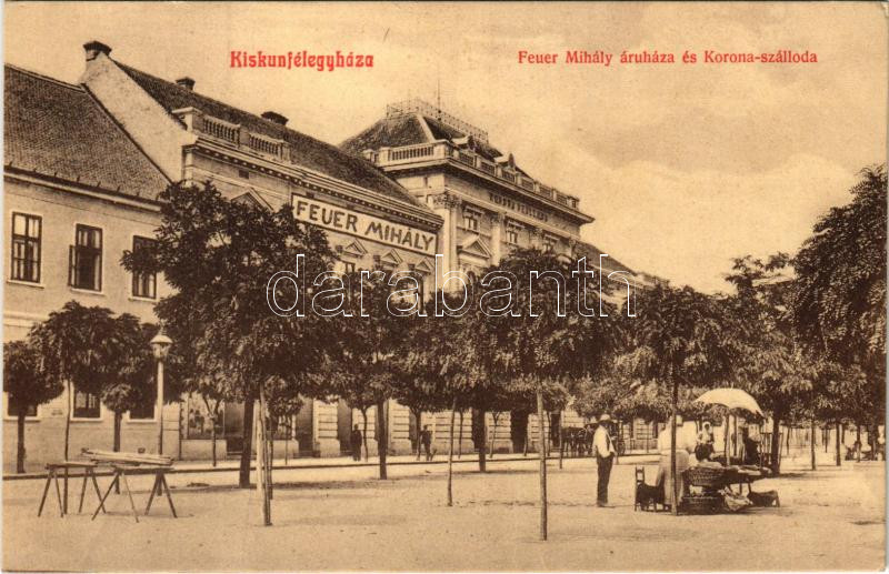 Kiskunfélegyháza, Feuer Mihály áruháza, Korona szálloda, piaci árus