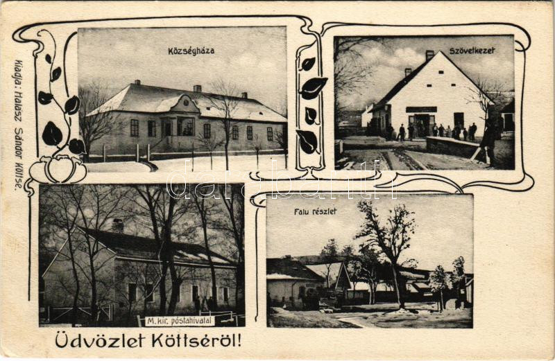 Kötcse, Köttse (Siófok); községháza, falu részlete télen, m. kir. postahivatal, szövetkezeti üzlete. Halász Sándor kiadása, Art Nouveau