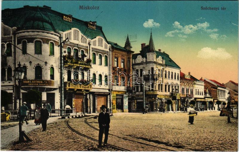 Description: Miskolc, Széchenyi tér, havas Arthur és társa gabona üzlete, Zeichner Adolf, Löwinger Arnold király áruház, Stern és Handelsmann és Dévényi Testvérek üzlete. Vasúti levelezőlapárusítás 59. 1915.