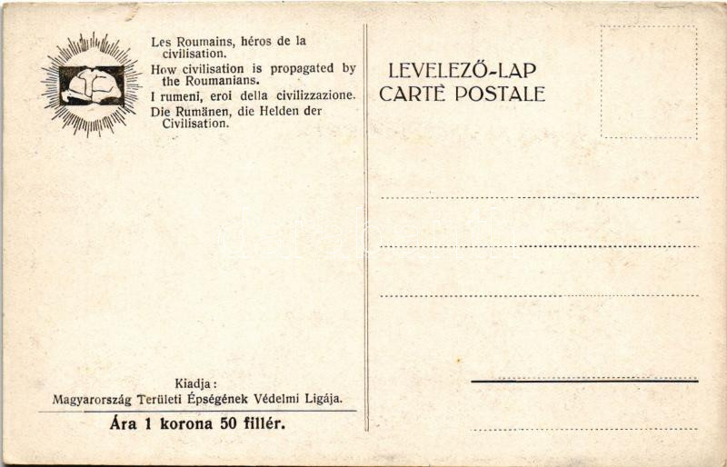 Description: Kultúra 1919. Románok: a civilizáció hősei. Magyarország Területi Épségének Védelmi Ligájának kiadása / Hungarian irredenta art postcard, anti-Romanian propaganda s: Tary
