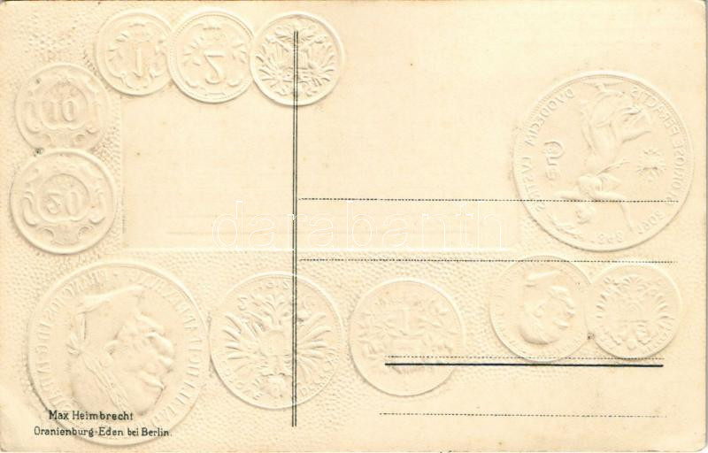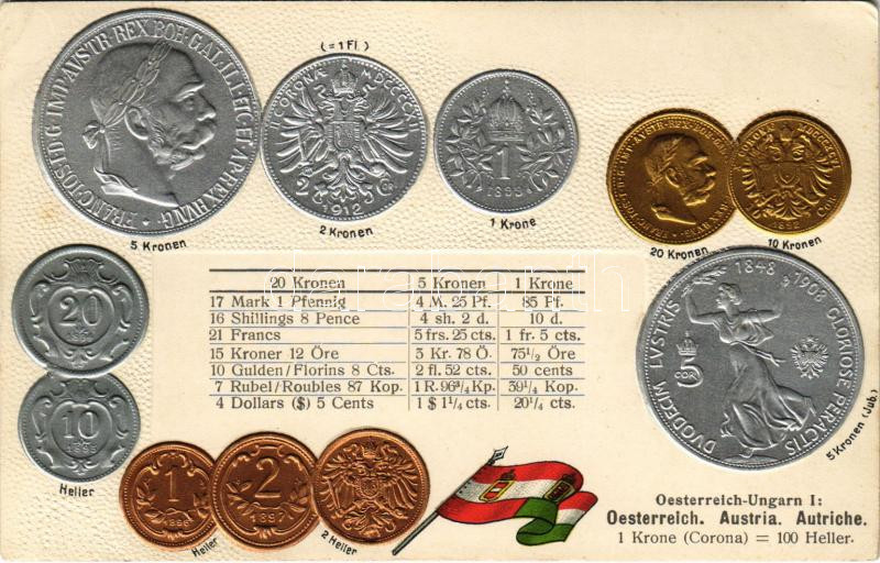 Description: Österreich-Ungarn I: Österreich - Münzenkarte und Nationalflagge / Ausztria - érmék és zászló. Dombornyomott / Austrian coins and flag. Max Heimbrecht embossed, litho (EK)