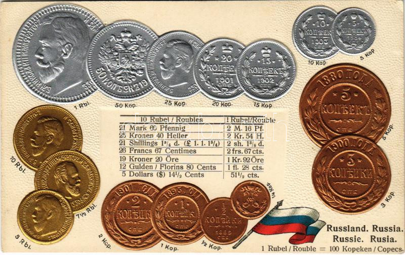 Russland - Münzenkarte und Nationalflagge / Oroszország - érmék és zászló. Dombornyomott / Russian coins and flag. Max Heimbrecht embossed, litho (EK)
