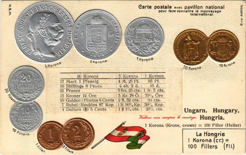 Ungarn - Münzenkarte und Nationalflagge / Magyarország - érmék és zászló. Dombornyomott / Hungarian coins and flag. H.S.M. embossed, litho (EK)