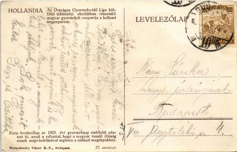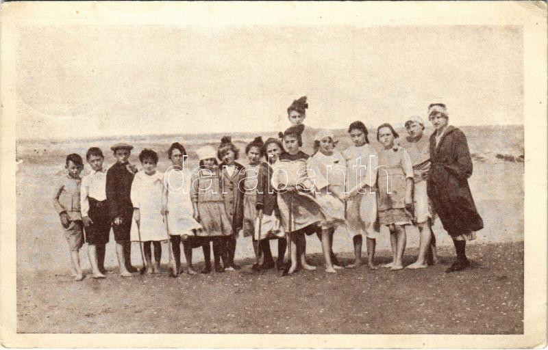Description: Az Országos Gyermekvédő Liga külföldi üdültetési akciójában részesülő magyar gyermekek csoportja a holland tengerparton. Ezen levelezőlap az 1925. évi gyermeknap emlékéül adatott ki. 11. sorozat / Hungarian National Child Protection League propaganda (EK)