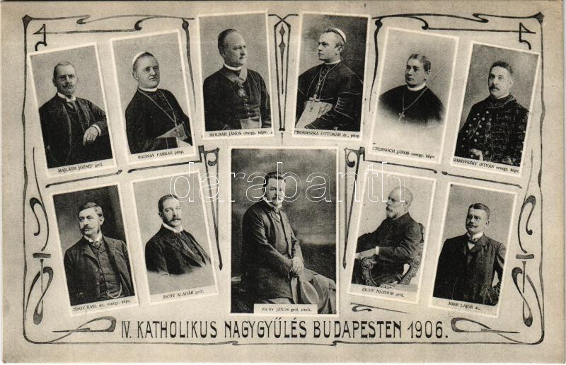 1906 IV. Katolikus Nagygyűlés Budapesten. Prohászka Ottokár, Majláth József, Zichy Aladár, Zichy János, Molnár János, Csernoch János, Radnay Farkas, Nagy Emil, Zichy Nándor, Mike Lajos, Rakovszky István / 4. Catholic Congress in Budapest. Art Nouveau frame