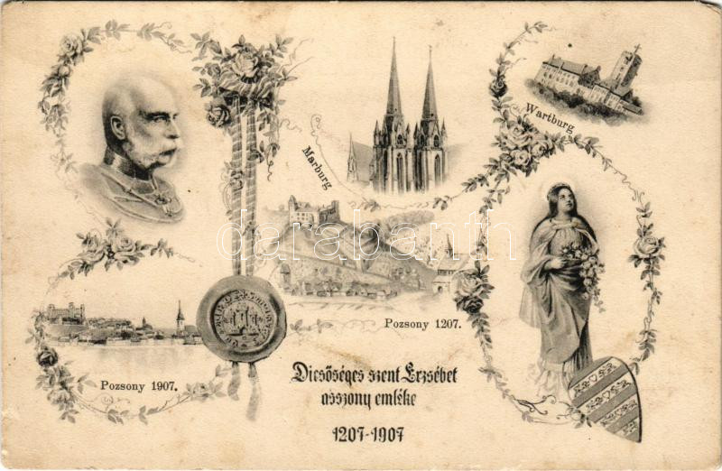 Description: 1207-1907 Pozsony, Pressburg, Bratislava; Wartburg, Marburg, Ferenc József. Dicsőséges Szent Erzsébet asszony emlékére / Franz Joseph, 700th anniversary of the birth of Saint Elizabeth of Hungary. Art Nouveau, floral (Rb)