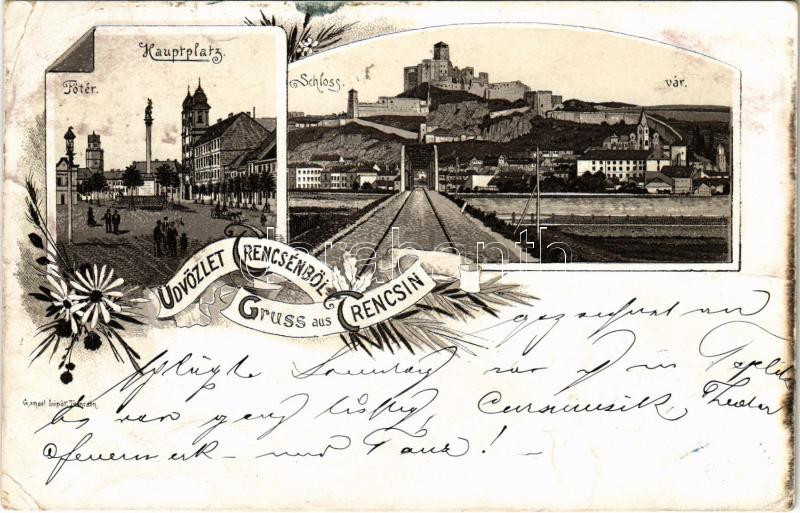 1897 (Vorläufer) Trencsén, Trencín; Fő tér, vár, vasúti híd. Gansel Lipót / main square, castle, railway bridge. Art Nouveau, floral, litho (EK)