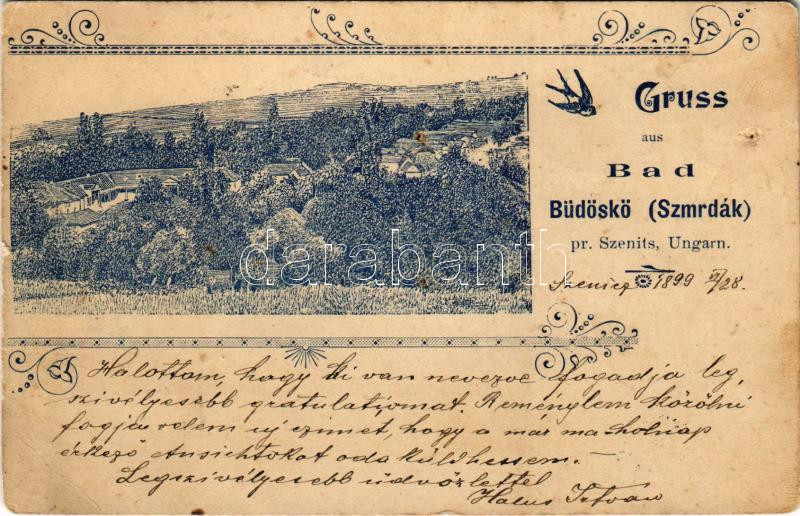 1899 (Vorläufer) Büdöskő-fürdő, Smrdáky Kúpele, Szmrdák (Szenice, Senica); Szecessziós fecskés üdvözlőlap / Art Nouveau greeting with swallow (lyuk / pinhole)