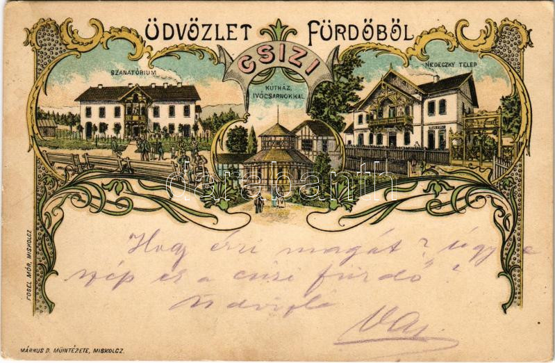 1899 (Vorläufer) Csíz, Csízfürdő, Kúpele Cíz; Szanatórium, kútház ivócsarnokkal, Nedeczky telep. Fogel Mór kiadása. Márkus D. műintézete / spa, sanatorium, spring source, villa. Art Nouveau, floral, litho (EK)