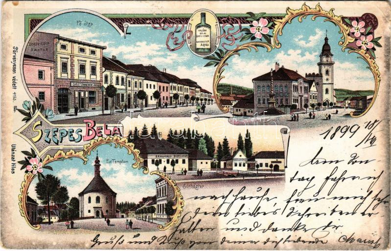 1899 (Vorläufer) Szepesbéla, Spisská Belá; Fő utca, Sörháztér (Brauhaus Bierschank), Evangélikus templom, Béla szálloda, Borovicska raktár, Gretzmacher Árpád üzlete / main street, beer hall, church, shops, hotel. Art Nouveau, floral, litho (EK)
