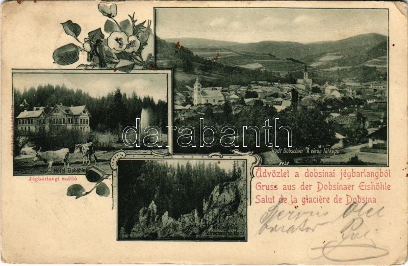 1900 Dobsina, Dobschau; Jégbarlangi szálloda, Sztracenai sziklakapu / Hotel Eishöhle, Felsenthor / Skalná brána (Stratena) / hotel and rock. Art Nouveau, floral (kis szakadás / small tear)