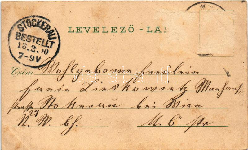 1900 Vágújhely, Neustadt an der Waag, Nové Mesto nad Váhom; K. Kirche, Bad, Markt / Római katolikus templom, Fürdő, Hotel Neubauer szálloda, Piac, üzletek. Hungaria kiadása / Catholic church, spa hall, hotel, market, shops. Art Nouveau, floral, litho (Rb)