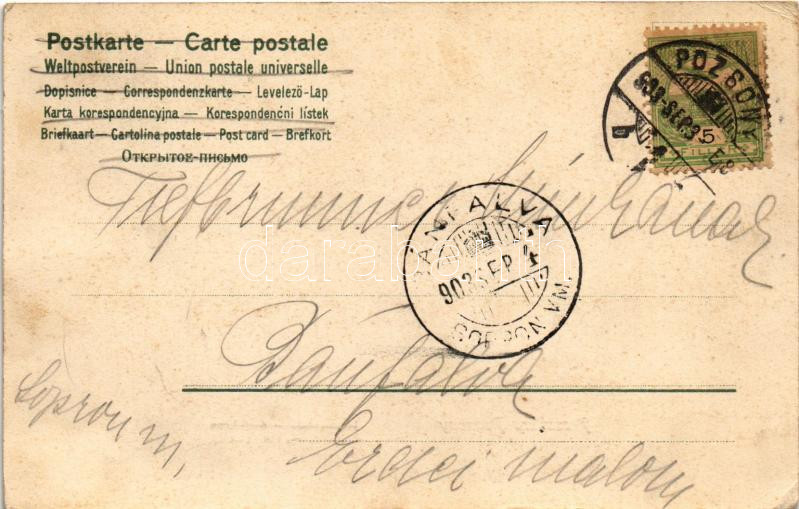 1903 Pozsony, Pressburg, Bratislava; Fő tér, városház. Bediene dich allein Art Nouveau, floral, litho / main square, town hall (EK)