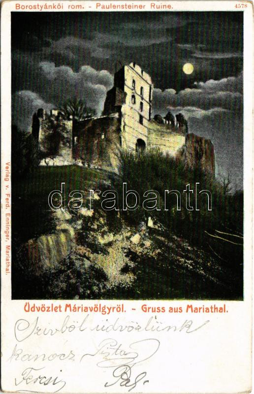 1905 Borostyánkő, Pajstún (Pozsonyborostyánkő, Borinka); Üdvözlet Máriavölgyről, várrom este. Ferd. Enninger / castle at night, Greetings from Marianka (Rb)