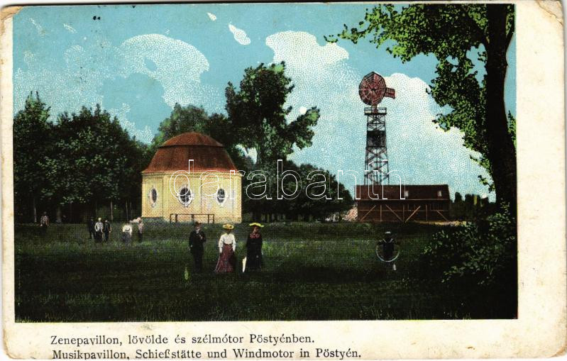 1913 Pöstyén, Pistany, Piestany; Zenepavilon, lövölde és szélmotor (sz...