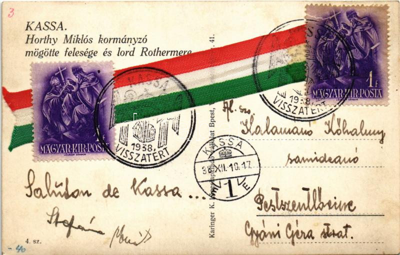 Description: 1938 Kassa, Kosice; bevonulás, Horthy Miklós kormányzó mögötte felesége és lord Rothermere. Hátoldalra ragasztott magyar szalag / entry of the Hungarian troops. Hungarian ribbon glued on the backside + "1938 Kassa visszatért" So. Stpl