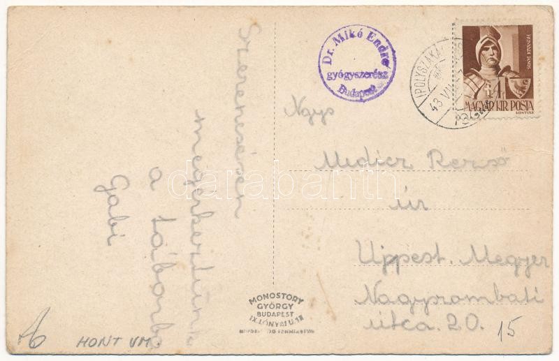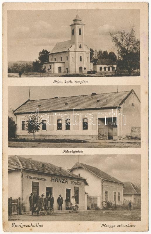 1943 Ipolyszakállos, Sakálos, Ipelsky Sokolec; Római katolikus templom, Községháza, Hanza (Hangya) Szövetkezet üzlete és vendéglője, étterem / Catholic church, town hall, cooperative shop and restaurant, inn (kopott sarok / worn corner)