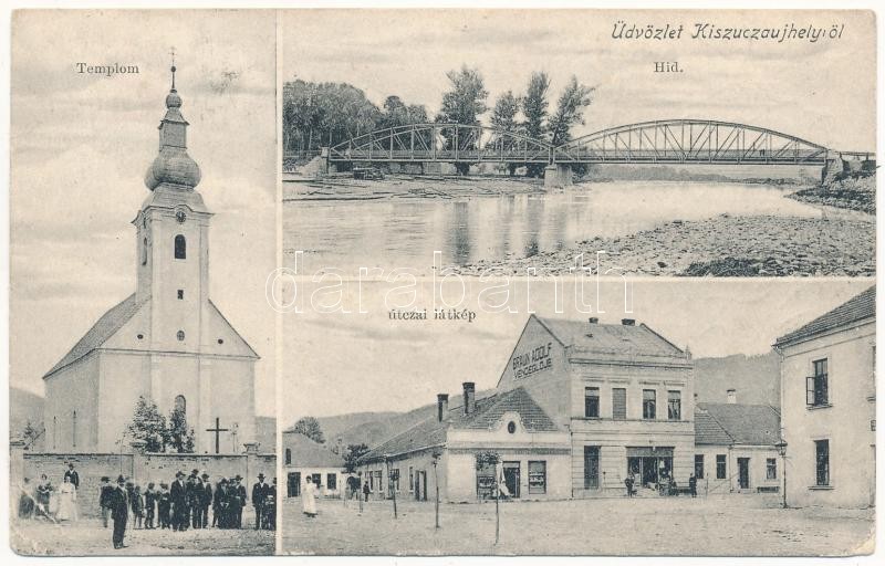 Kiszucaújhely, Kysucké Nové Mesto; templom, híd, utca, Braun Adolf vendéglője, Schlang. üzlete / church, bridge, street, restaurant, shop (EK)