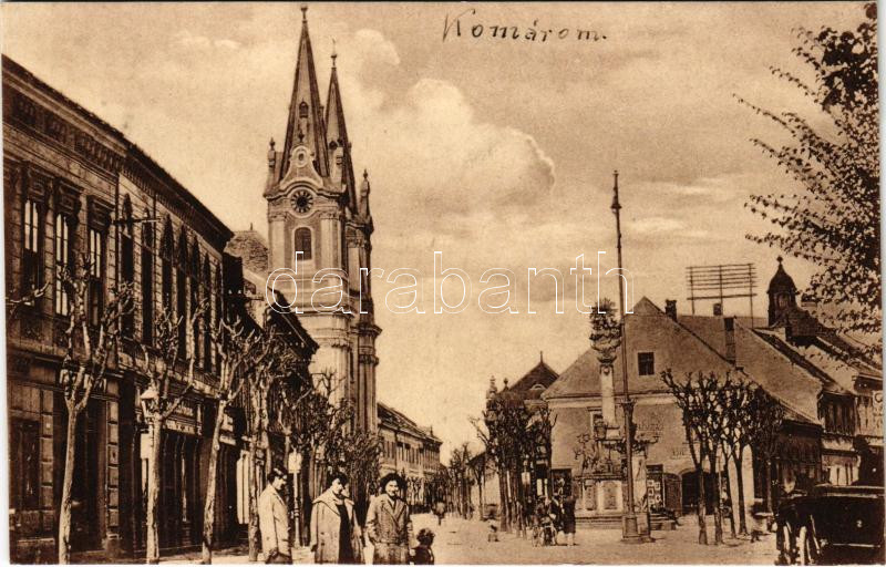 Komárom, Komárnó; Nádor utca, templom, Szentháromság szobor, üzletek /...