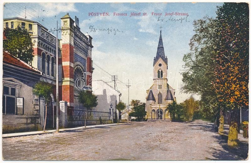 Pöstyén, Piestany; Ferenc József út, zsinagóga és evangélikus templom....