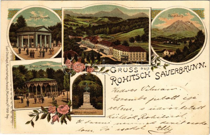 1898 (Vorläufer) Rogaska Slatina, Rohitsch-Sauerbrunn; Tempelbrunnen, Donatiberg, Styria Quelle, Attems Monument / temple fountain, statue. Carl Otto Hayd No. 1313. Art Nouveau, floral, litho
