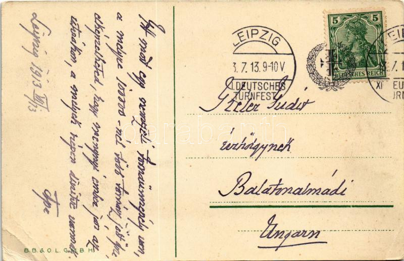 1913 12. Deutsches Turnfest in Leipzig 12-16. Juli / 12th German Gymnastics Festival advertising art postcard. B.B. & O.L. Gmbh. Art Nouveau (EK)