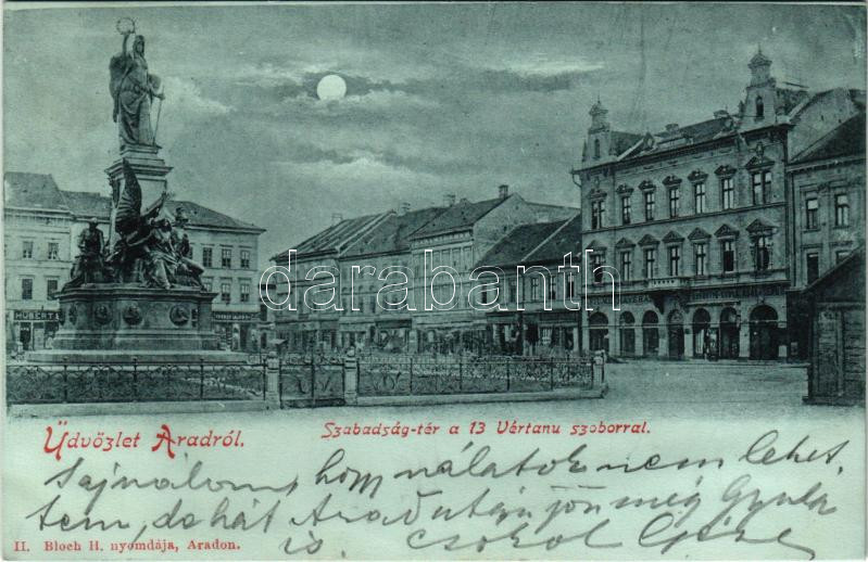 1899 (Vorläufer) Arad, Szabadság tér, 13 vértanu szobor, este, Fiume kávéház, Derestye Gyula, Farber Lajos, Hubert és Rosenberg üzlete. Boch H. nyomda kiadása / martyrs' statue, square, night, shops, cafe (fl)