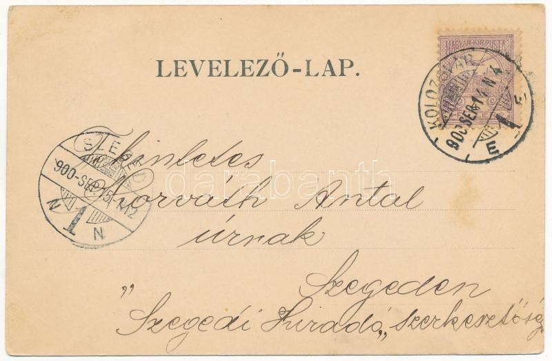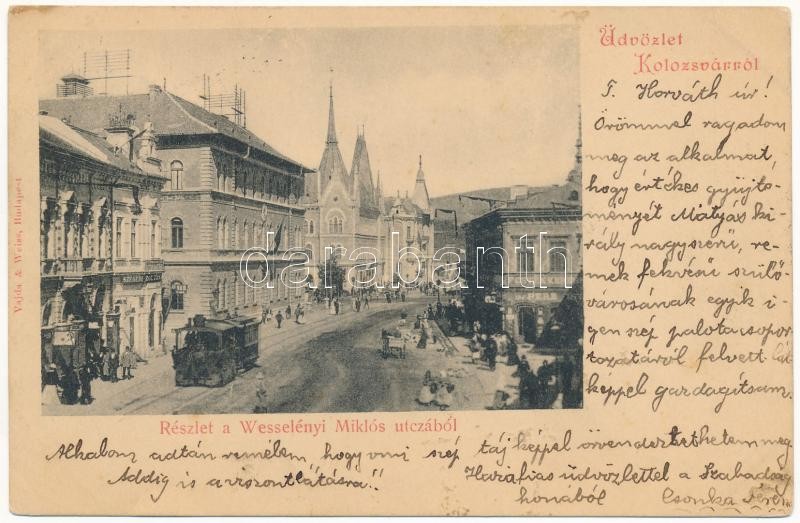 1900 Kolozsvár, Cluj; Wesselényi utca, városi vasút, kisvasút, vonat, ifj. Pere festékkereskedése, Szegedi Zoltán üzlete, bútorraktár. Vajda & Weiss / street, shops, urban railway, locomotive, train