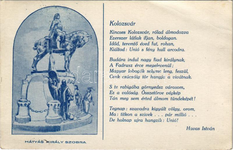 https://www.darabanth.com/en/39-Major-auction/39.1/Postcards/Transylvania~16041/1933-Kolozsvar-Cluj-Matyas-kiraly-szobor-Havas-Istvan-verse-Csengery-Antal-szoboralap-bizot~II2731485