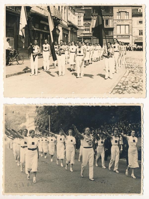 1938 Brassó, Kronstadt, Brasov; Kolping mozgalom sportegyletének felvonulása június 8-án, náci karlendítések, háttérben Ageco Bodega étterem, üzletek. Foto Adler Oscar / Hungarian parade of the sports club of the Kolping Society (Kolpingwerk), Nazi salute, restaurant, shops - 2 db eredeti fotó / 2 original photos