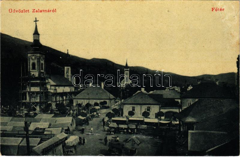 Description: Zalatna, Zlatna; Fő tér, piac, építés alatt álló templom felállványozva, Verseny bazár üzlete. W.L. 3204. / main square, market, church under construction, shop (fl)