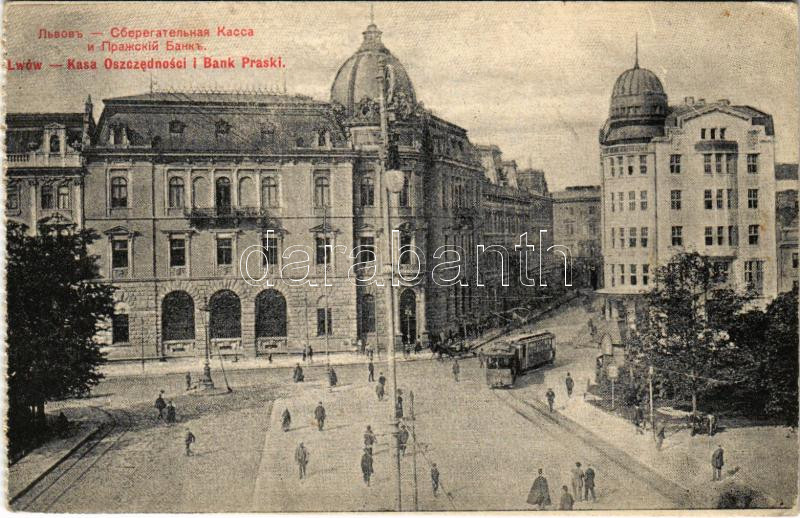 Lviv, Lwów, Lemberg; Kasa Oszcednosci i Bank Praski / street view, bank, tram (EK)