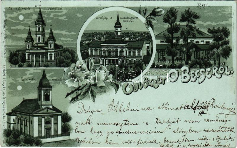 Description: 1899 (Vorläufer!) Óbecse, Stari Becej; Görög katolikus szerb és Római katolikus templomok, városháza, szabadságharc emléke, Lőkert. Kapható Löwy Lajosnál / churches, town hall, military monument. Art Nouveau, floral, litho